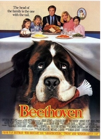 애완견 샵을 돌면서 몰래 강아지들을 훔쳐서 약물 실험을 하던 동물학대 흉악범들이 급히 도망가던 중 다행히도 비글과 세인트버나드는 트럭에서 탈출에 성공합니다. 그러나 어린 세인트버나드는 쓰레기통에서 밤을 보내고, 혼자 길거리를 헤매던 중 신문을 가지러 나온 조지(찰스 그로딘) 몰래 집으로 들어갑니다. 갑자기 집안으로 온 어린 세인트버나드를 본 아내 앨리스(보니 헌트)와) 세 아이들(라이스, 테드, 에밀리)은 강아지를 보고 너무 좋아합니다. 조지는 베토벤 때문에 집안이 지저분해지고, 모든 식구의 관심이 베토벤에게만 집중되면서 소외감도 느끼며 베토벤을 싫어합니다. 필사적인 노력으로 온갖 구실을 붙여 베토벤을 집에서 내보낼 궁리를 하지만 작전은 실패하고 아이들의 성화에 못 견디고 결국 가족으로 받아들입니다. 특히 영화에서 막내 에밀리와의 조화는 무척 아름다운데요, 막내 에밀리가 피아노로 친 베토벤 연주에 맞춰 짖으면서 강아지 이름은 베토벤이 됩니다.