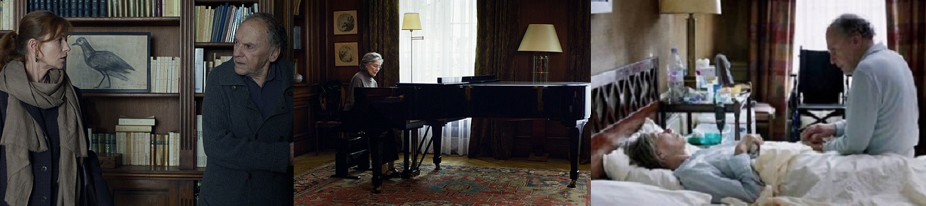노쇄한 몸의 불편이 의사 표현을 못해 소통까지 불가능한 상황이 되면, 자신과 가족은 어디까지 그 참담함을 참아낼 수 있을까요? 불편한 다리로 안느를 지극히 보살피는 남편 조르주, 일상을 아무렇지 않게 지내고 싶지만 점차 지칩니다. 누구의 손도 아닌 남편의 손길에서 유일한 위안을 느끼는 안느지만, 자신의 의지대로 할 수 없어 점점 괴팍하게 마음까지 병들어가는 모습이 무척 안타깝습니다. 결국은 안느를 병원에 보낼 수 없는 조르주의 마음이, 안느의 마지막 모습으로 나타납니다. 안느를 곱게 단장시켜 아름다운 꽃잎으로 장식하는 조르주, 안느의 아름다웠던 삶과 죽음의 존엄성을 지켜내는 그의 사랑은 현실적 선택을 합니다.
