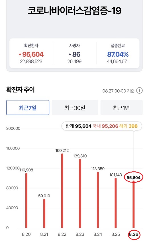 코로나 확진이 된 날, 확진자는 95,604명이었고 저도 저 숫자 중 하나였습니다. 사망자는 86명으로 그 수치도 꾸준히 비슷한 숫자가 유지되는 듯합니다. 간혹 기록을 위해 확인하는 것이었지만, 이번 기록은 막상 코로나 확진이 '내 경우'가 되고 나니 사뭇 느낌이 다릅니다.