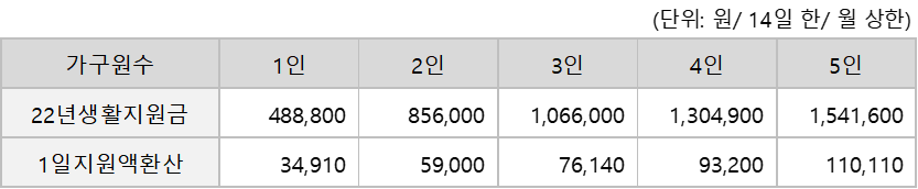 '22년 2월 14일 이전까지는 최대 14일까지 격리 기간을 적용하였으나 2월 14일 이후에는 모두 7일로 격리 기간이 축소되었습니다. 따라서, 생활지원비는 자가격리 기간 7일을 적용하여 1일 지원액 환산액 34,910원('22년 최저시급 적용) 기준으로 7일간 격리 후 해제된 경우 34,910*7=244,370원이 됩니다. 월 상한액은 488,800원입니다.