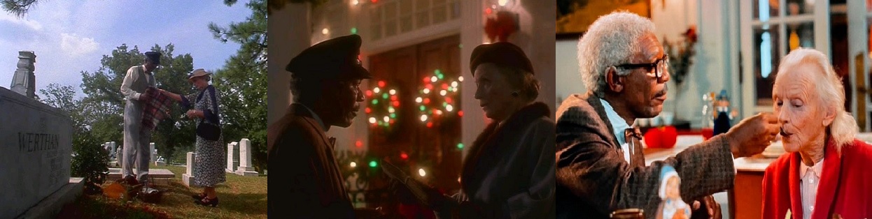 다민족 국가인 미국이 겪고 있던 인종 차별과 종교적 갈등, 신분 차이와 빈부 격자, 사회적 편견 등이 바탕에 깔린 사회상을 그대로 보여줍니다. 성공한 유대인으로서 모든 행동에 주위의 평판을 신경 쓰는 데이지 여사의 모습과 사업상 불이익이 발생할까 염려하며 루터 킹 목사의 연설에 참석하지 못하는 불리의 사업가로서의 입장 등이 당시의 상황을 있는 그대로 보여주는 듯합니다. 그럼에도 불구하고 영화는 이런 복잡하고 무거운 내용보다 데이지와 호크 두 노인이 우정을 만들어 가는 소소한 스토리 전개 과정에 더 눈길을 두게 됩니다. 혹여 지루해 보일 수도 있지만 너무나 일상적인 연기가 이어져 여러 에피소드의 순간순간에 집중하게 됩니다. 데이지 여사의 외출과 집안일을 거드는 호크의 모습과 묘비명을 읽지 못하는 호크에게 읽는 방법을 알려주고 크리스마스에 '선물이란 사실을 끝까지 부정'하며 선물을 건네는 데이지 여사의 모습이 무척 자연스럽고 일상적으로 다가옵니다.