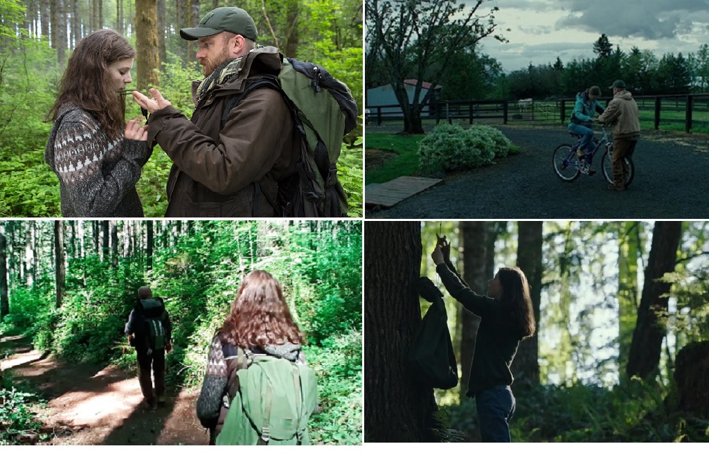 두 사람 중심의 영화는 처음부터 끝까지 잔잔하게 진행이 됩니다. 건조한 듯한 벤 포스터와 토마신 맥캔지의 연기가 무척 잘 어울립니다. 참전 후유증을 겪고 있는 윌의 괴로워하는 섬세한 감정들이 표정과 눈빛에서 하나하나 느껴집니다. 벤의 연기는 불안을 겪는 사람이면서도 목소리니 말투는 무척 차분합니다. 공원에서 들켜 캠프를 떠나야 할 때 톰이 반항하며 예민해지자 윌은 ‘잘못한 거 없으니까 협조해 ‘라고 톰에게 말합니다. 딸을 안심시키는 말에서 윌이 세상에 대해 두려움이 있는 것은 아니라는 생각이 들었습니다. 토마스는 여리지만 강한 자기 의지와 호기심이 한껏 묻어나는 신선한 연기를 펼칩니다. 안타까우면서도 가장 마음 푸근했던 장면은 톰에게 자전거를 가르쳐주는 평범한 아빠의 모습 윌이었습니다. 평화롭고도 아름다운 장면으로 기억에 남습니다.